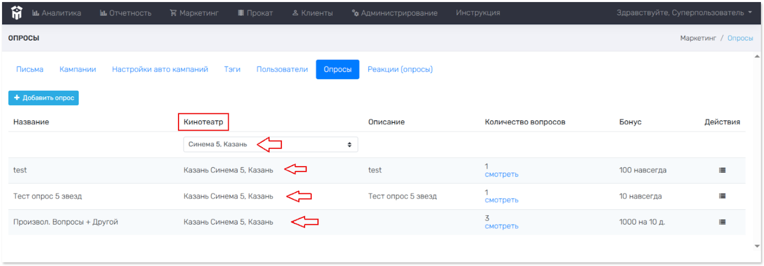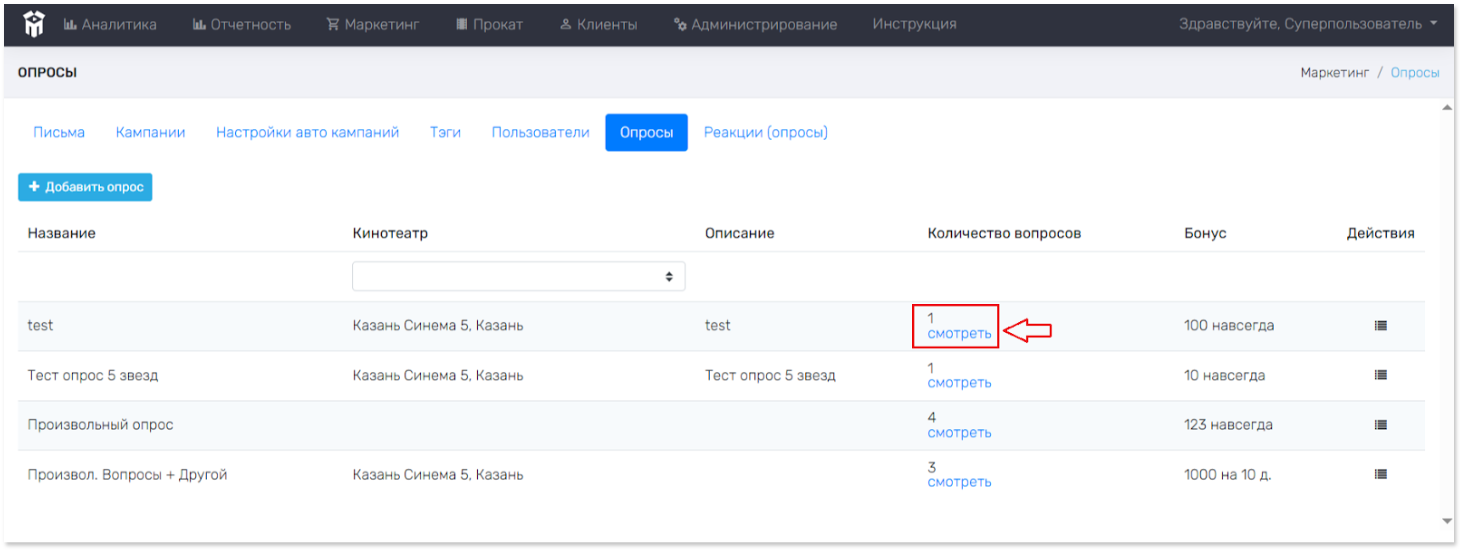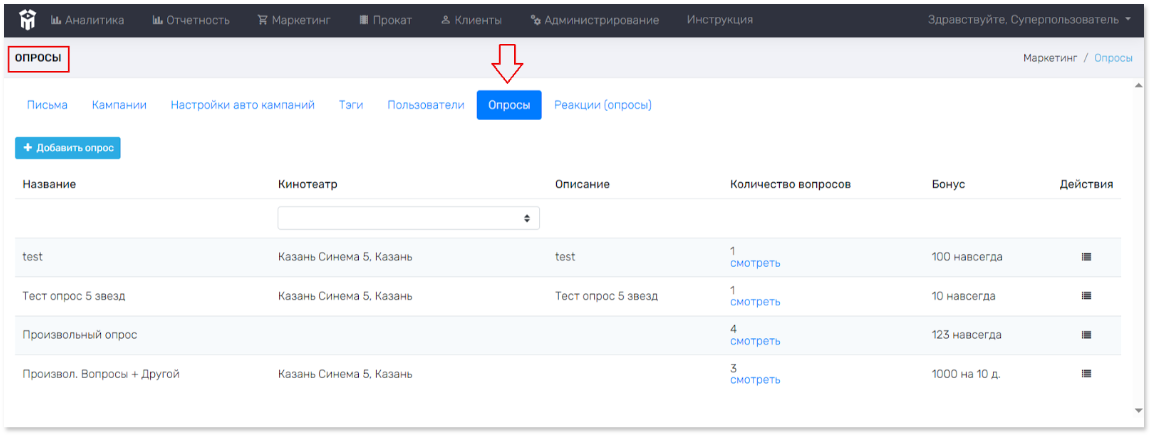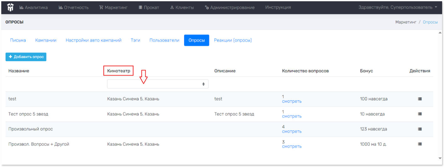 В открывающемся меню будут отображены все опросы сети кинотеатра.