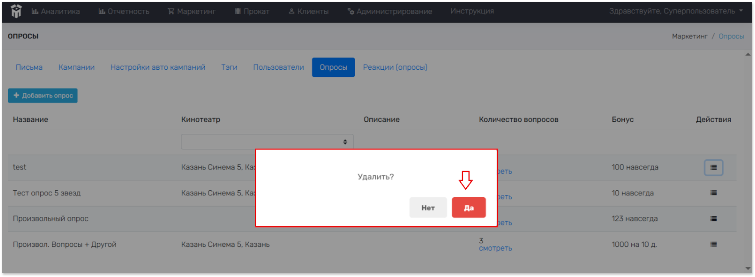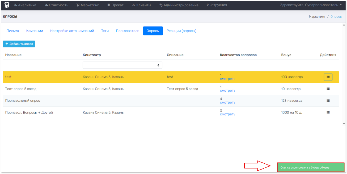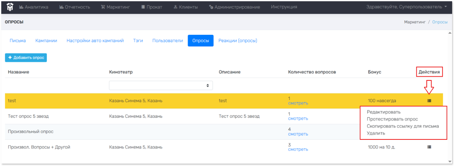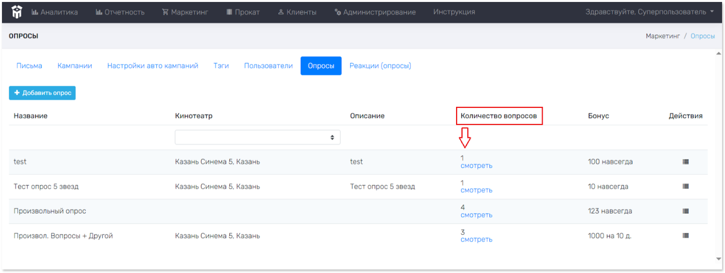 В открывающемся меню будут отображены все опросы сети кинотеатра.