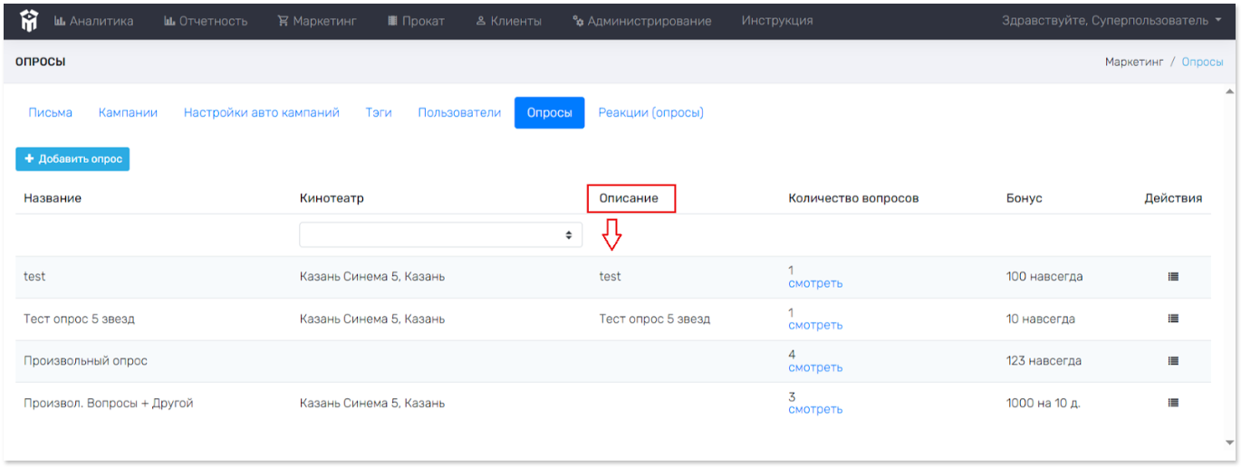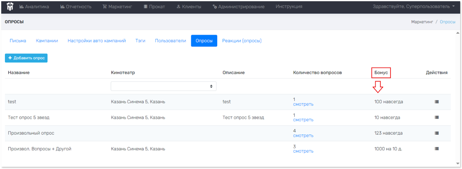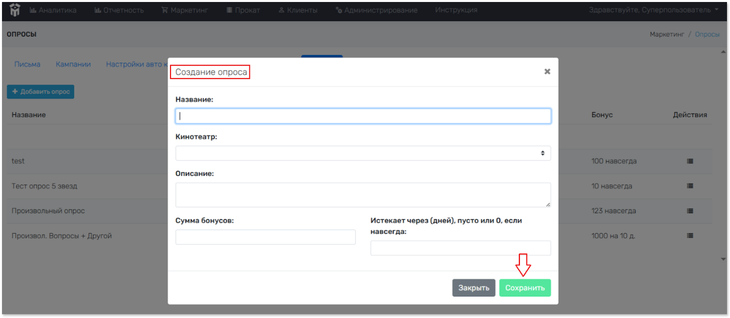 Редактировать – предоставляет возможность изменить название и описание опроса, изменить кинотеатр, сумму бонусов и период использования бонусов. Для сохранения изменений, необходимо нажать левой кнопкой мыши на строчку «Сохранить» в правом нижнем углу открытого меню.