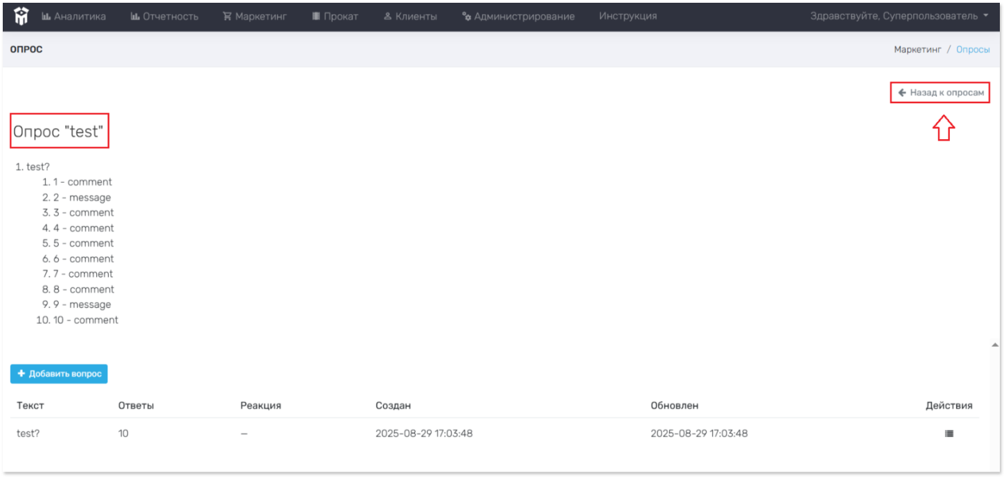 - Количество вопросов – указано количество вопросов, содержащихся в опросе;