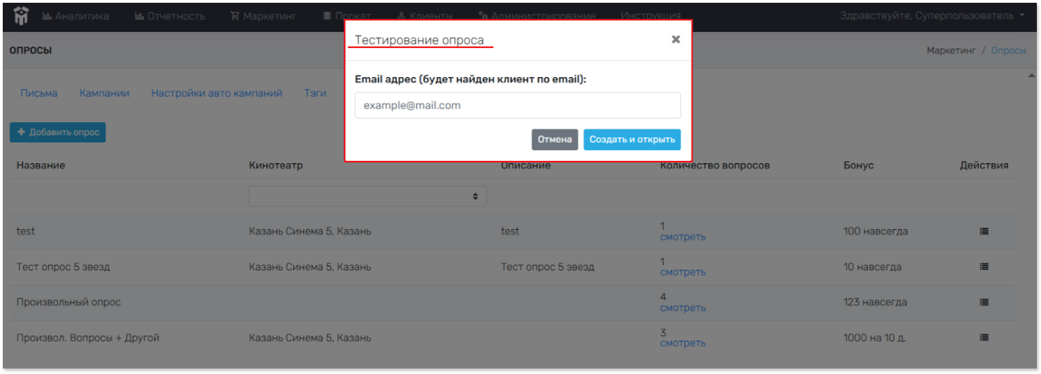 Для тестирования опроса необходимо нажать на кнопку «Создать и открыть».