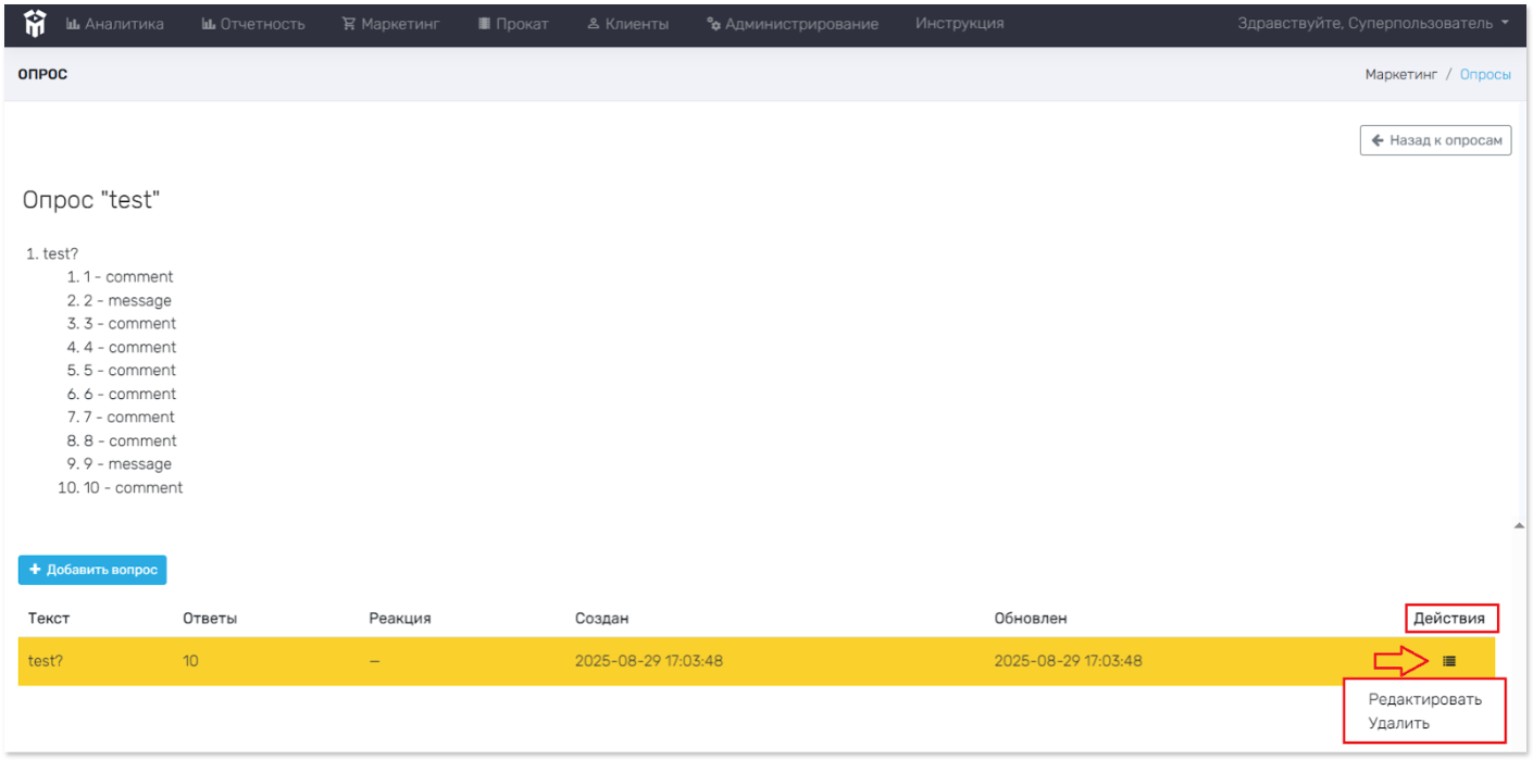 Вопросы в данном опросе возможно редактировать/удалить. Для этого необходимо нажать на значок в строчке с нужным опросом, и выбрать нужное действие в открывающемся меню.
