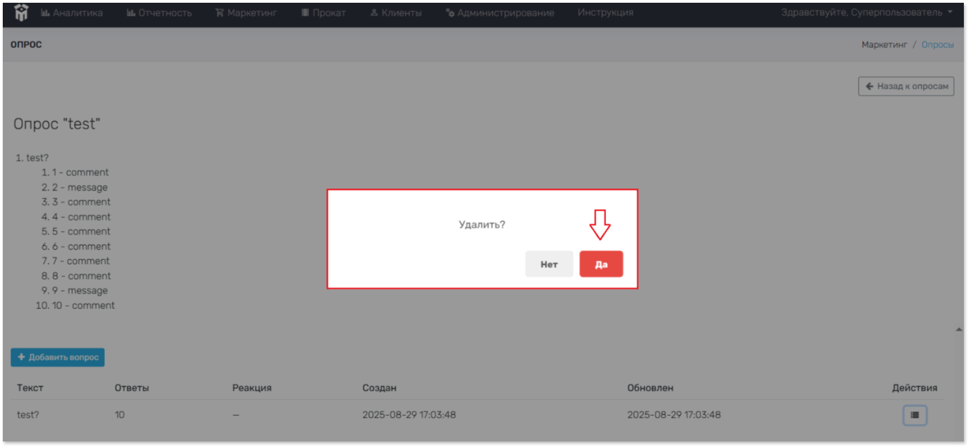 Удалить – предоставляет возможность удалить опрос. Для удаления опроса требуется подтвердить действие нажатием левой кнопкой мыши на слово «Да», либо для отмены действия на слово «Нет». После удаления опроса отменить данное действие НЕ возможно!
