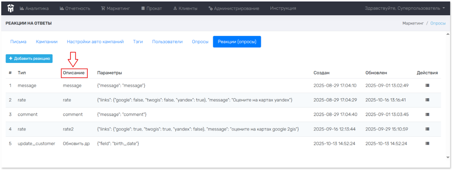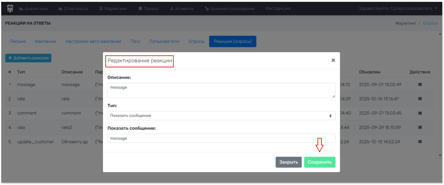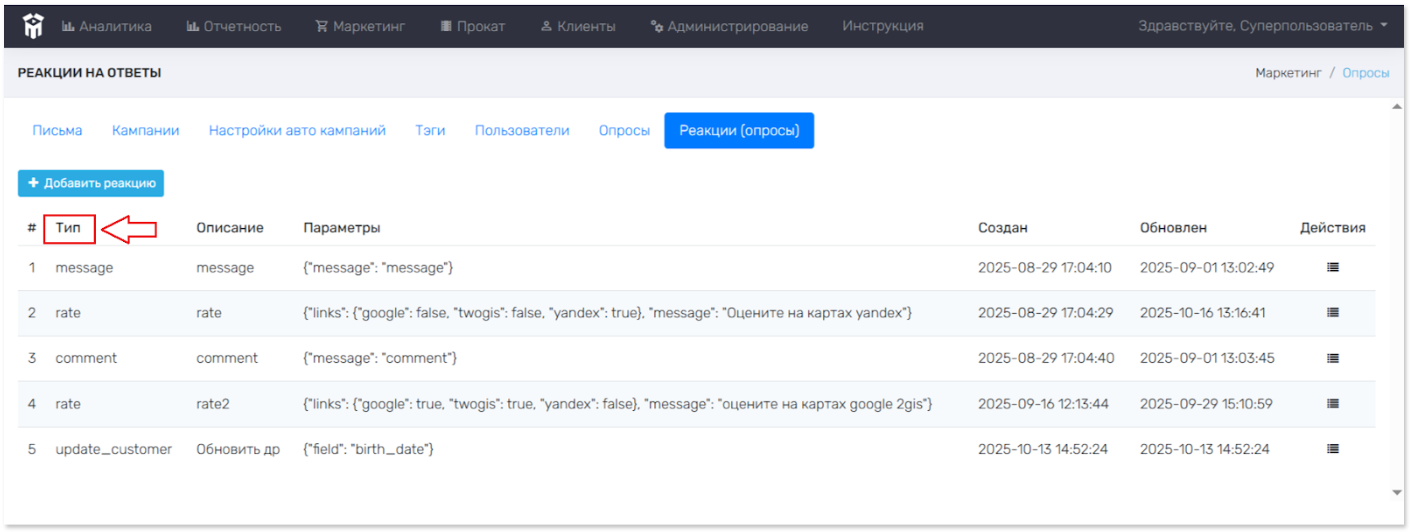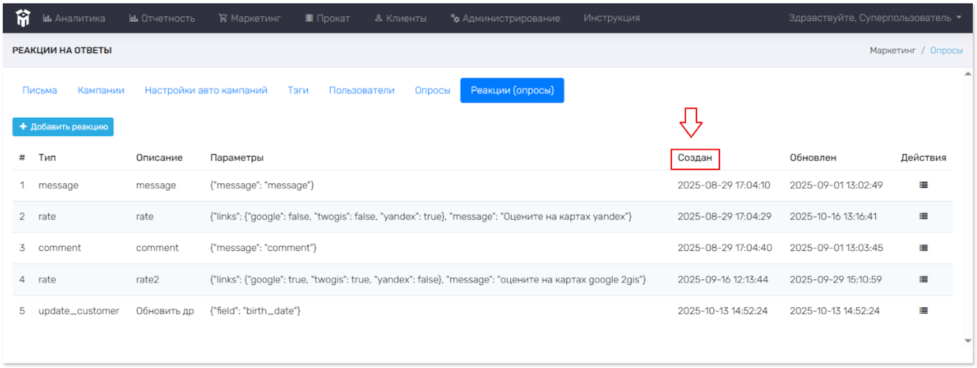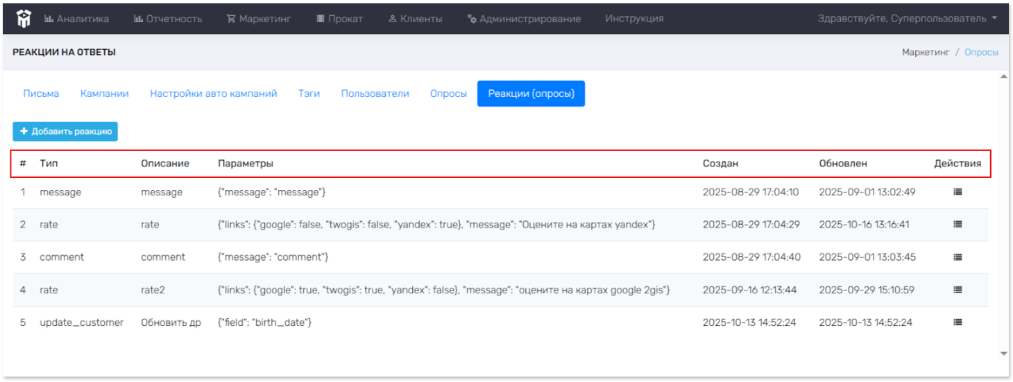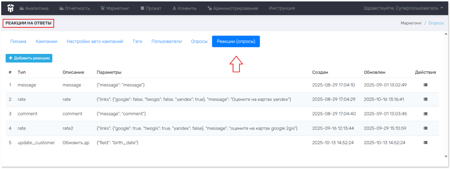Опросы > Реакции. Просмотр созданных реакций