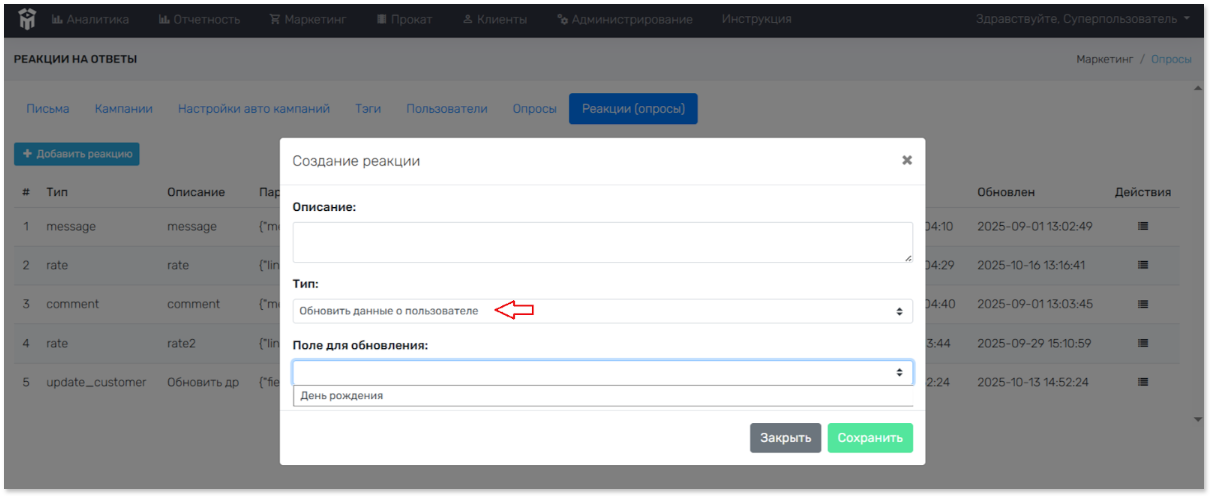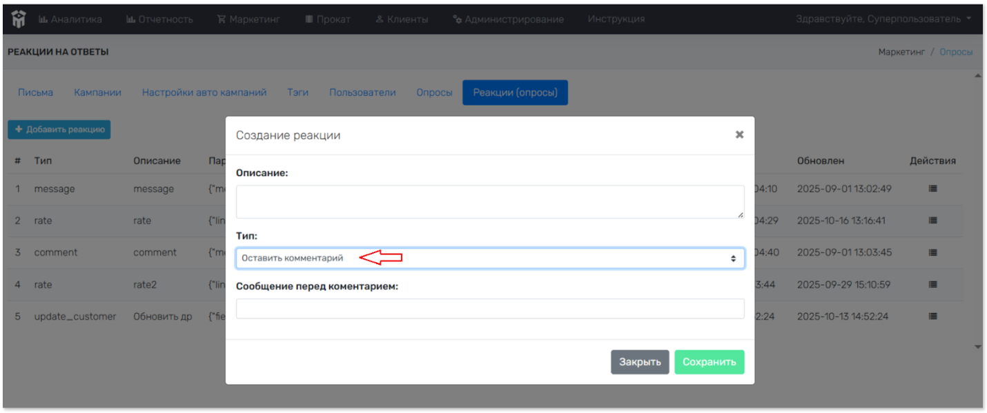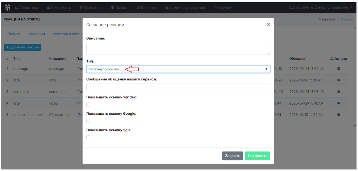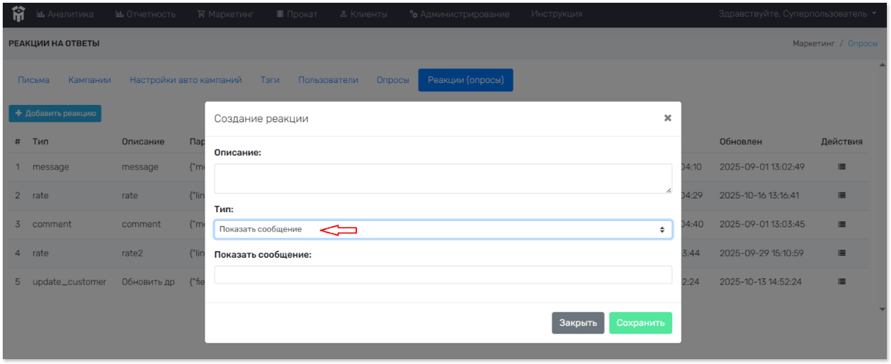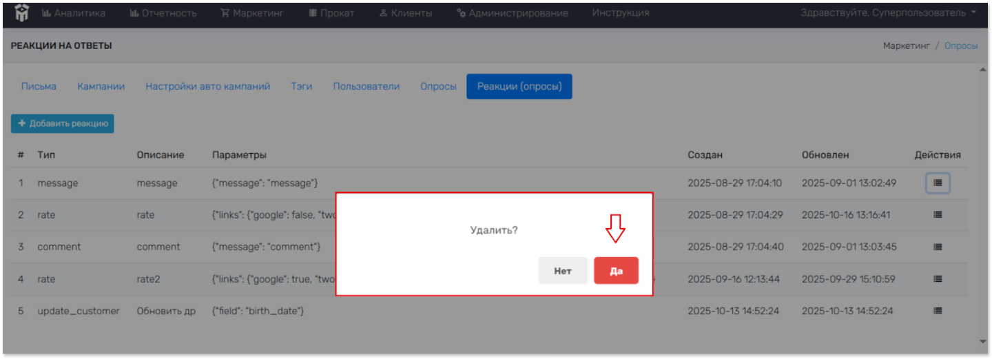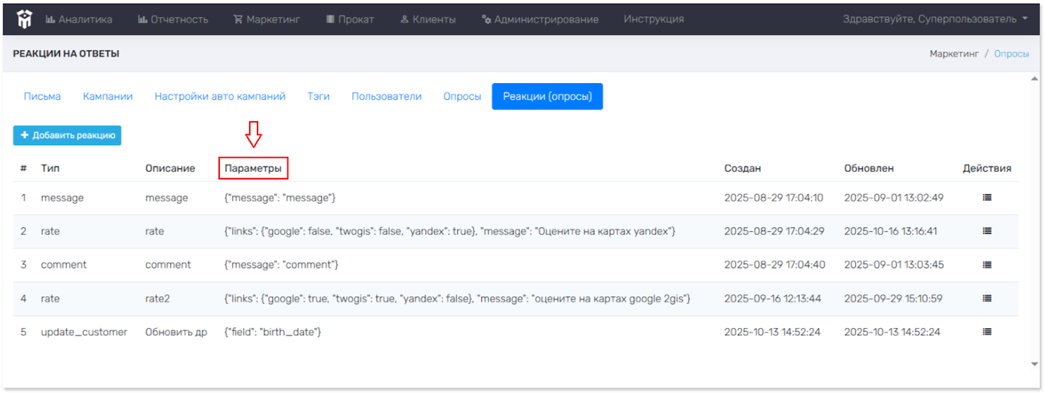Опросы > Реакции. Просмотр созданных реакций