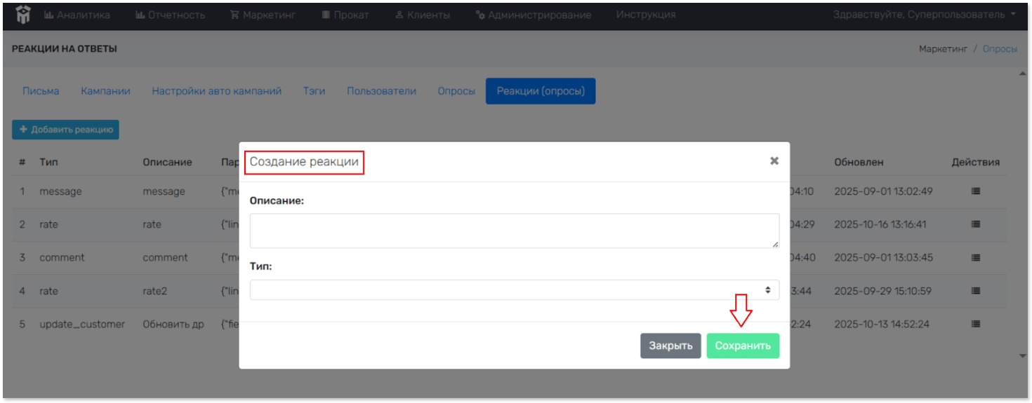 Перед сохранением Реакции (опрос), необходимо проверить всю информацию «Создание реакции»! Новая реакция автоматически отобразится во вкладке.