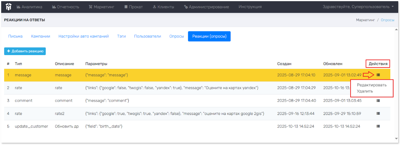 - Действия – возможность для редактирования/удаления реакции на ответ. Далее левой кнопкой мыши нажать на значок в строчке с нужной реакцией, и выбрать нужное действие в открывающемся меню.