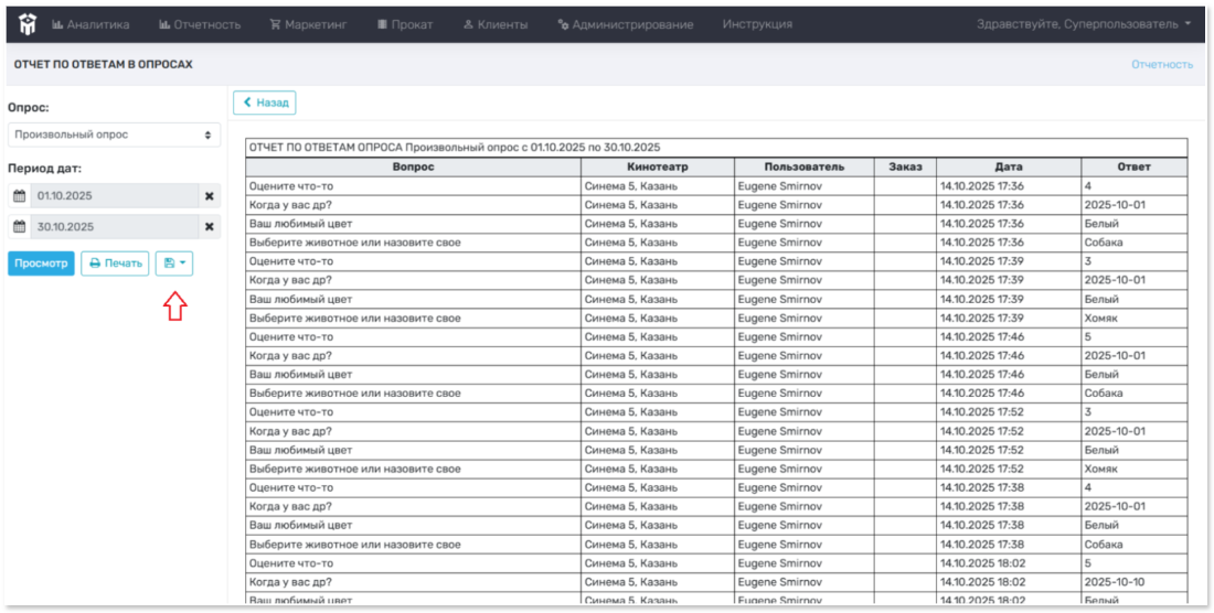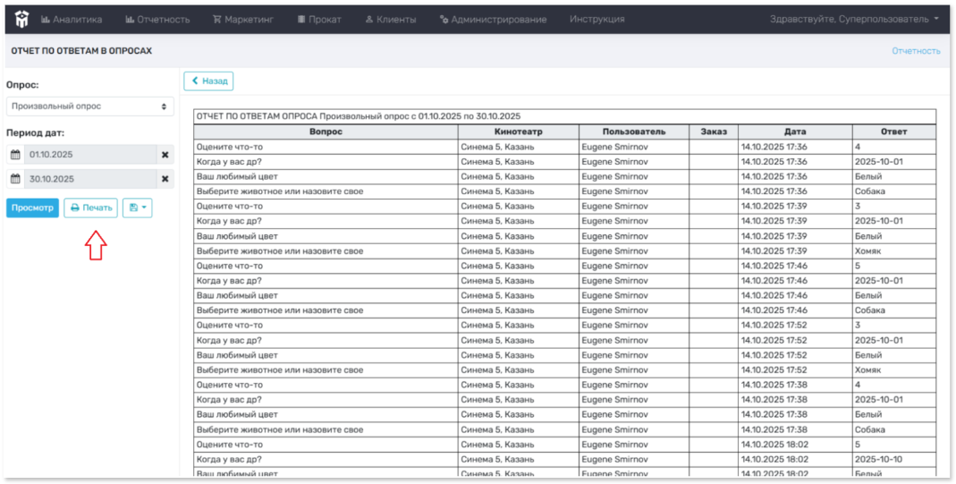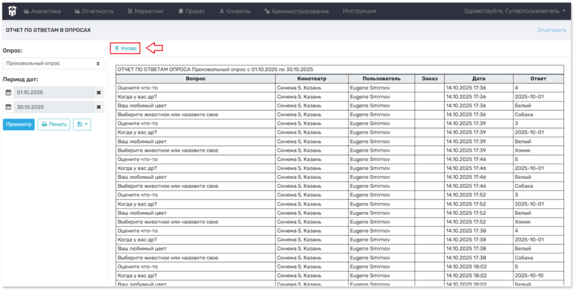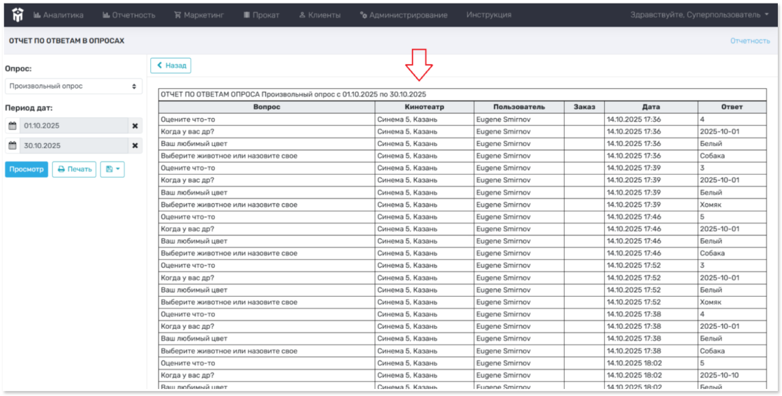Для просмотра отчета по прохождению опросов, необходимо нажать на кнопку «Просмотр». Далее в меню автоматически отобразится отчет по прохождению опросов в выбранном кинотеатре в указанный промежуток времени.