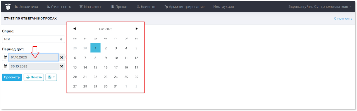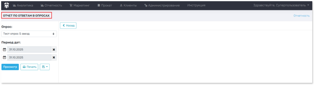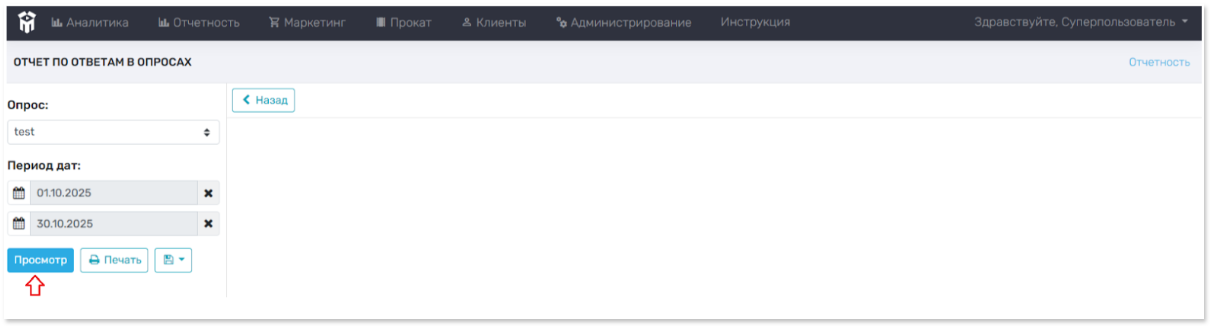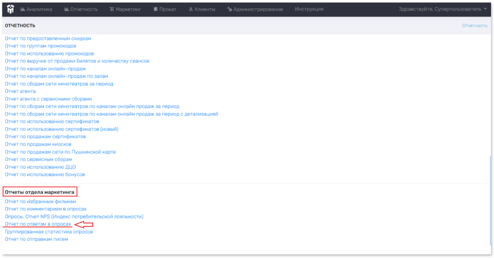 Для формирования отчета необходимо зайти в раздел Отчетность. Для этого нужно выбрать раздел Отчетность в верхней строке основного меню и выбрать в отчетах отдела маркетинга Отчет по ответам в опросах.