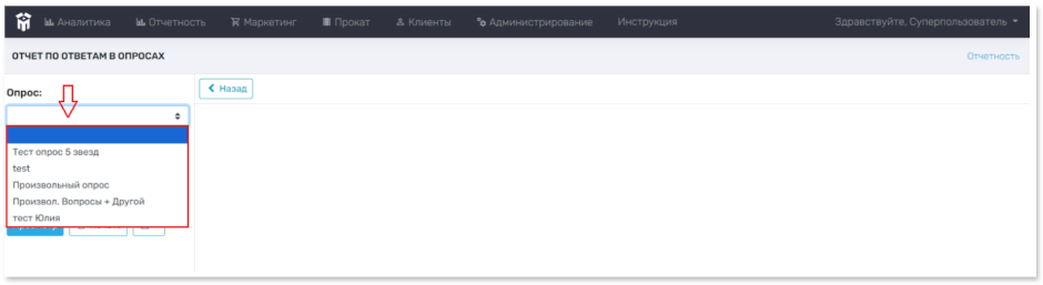 Для формирования отчета необходимо выбрать название опроса из предложенного списка. Для выбора названия необходимо нажать левой кнопкой мыши на пустую строчку для ввода текста (расположена под «Опросом») и выбрать название опроса из предложенного списка.