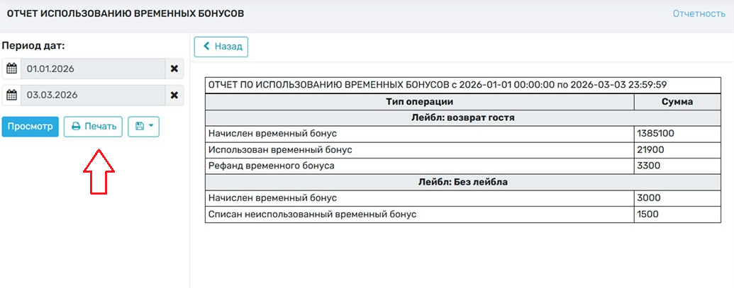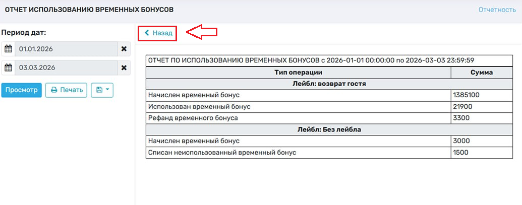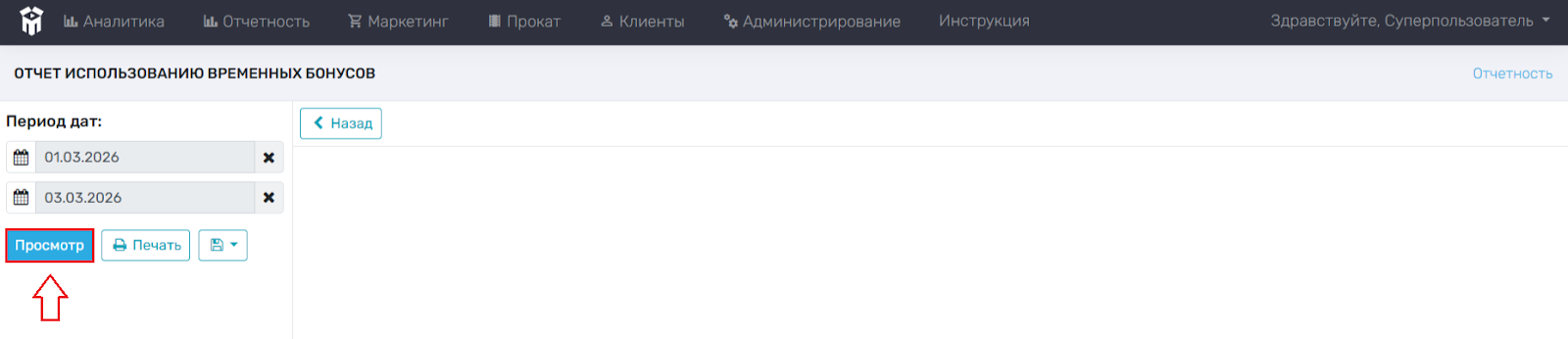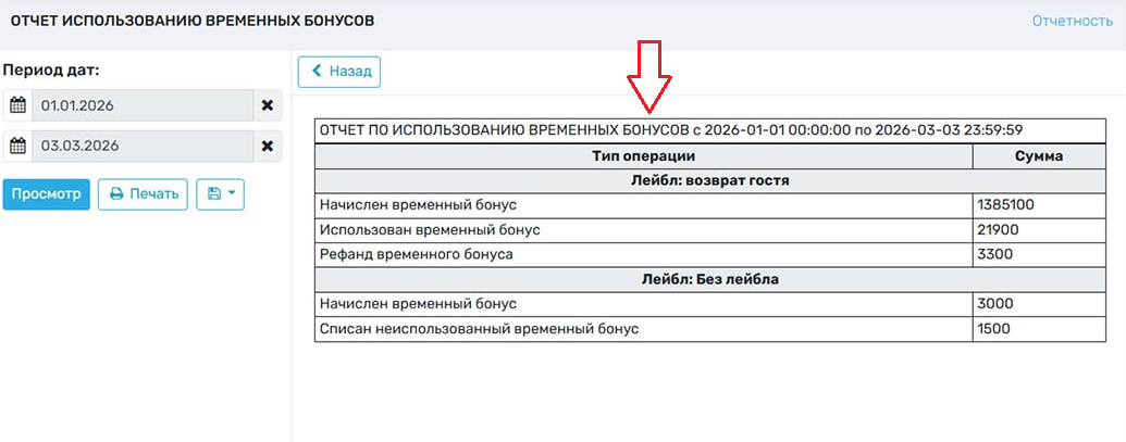 Для просмотра отчета по использованию временных бонусов, необходимо нажать на кнопку «Просмотр». Далее в меню автоматически отобразится отчет в указанный промежуток времени.