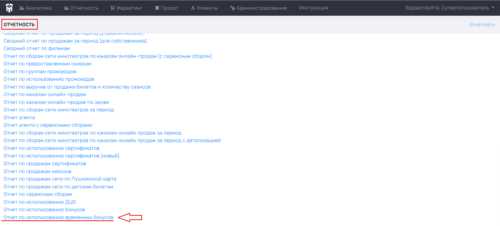 Для формирования отчета необходимо зайти в раздел Отчетность. Для этого нужно выбрать раздел Отчетность в верхней строке основного меню и выбрать в отчетах продаж Отчет по использованию временных бонусов.