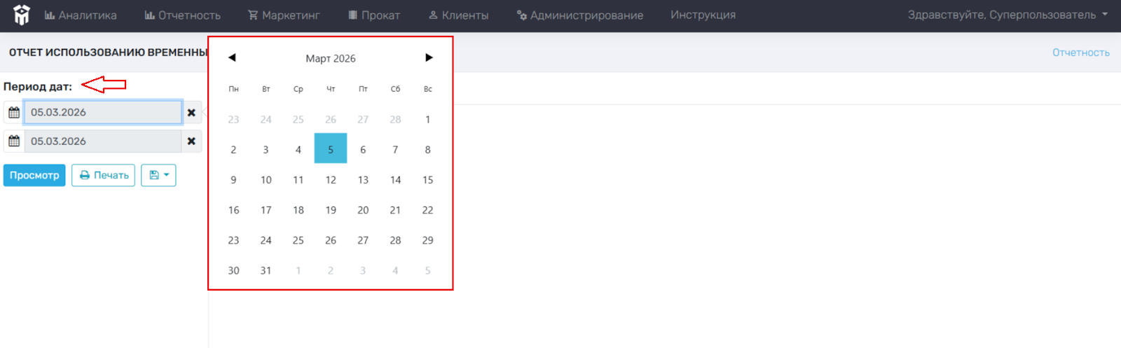 Для формирования отчета необходимо выбрать Период дат. Для выбора периода дат необходимо нажать левой кнопкой мыши на значок и выбрать интересующий период «От» и «До». Для удаления периода действия, необходимо нажать на «x» в строчке выбора даты.