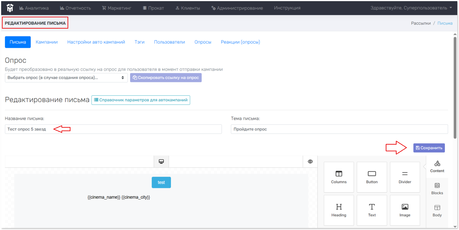 Редактировать – предоставляет возможность изменить название и тему письма, а также текст, содержащийся в письме. Для сохранения изменений, необходимо нажать левой кнопкой мыши на строчку «Сохранить» с правой стороны открытого меню. Выбранный опрос будет преобразовываться в реальную ссылку на опрос для пользователя в момент отправки кампании.