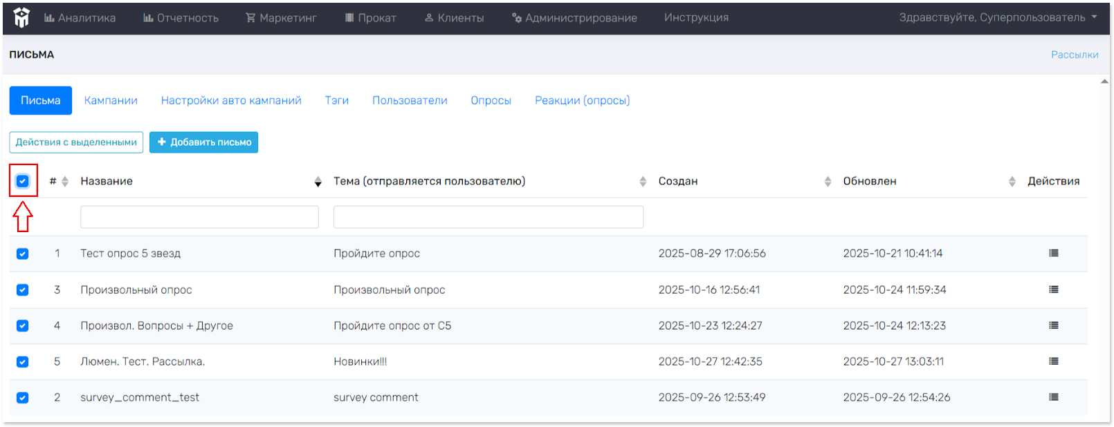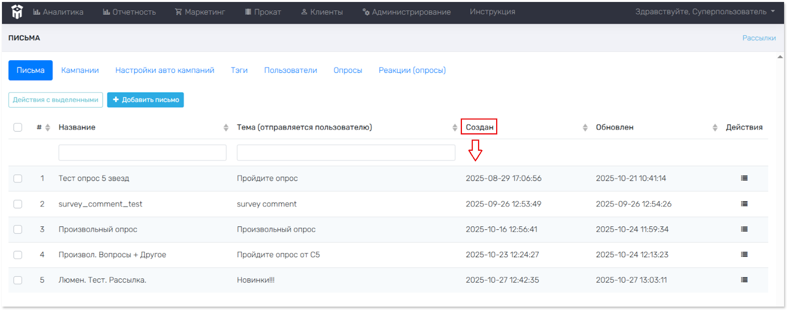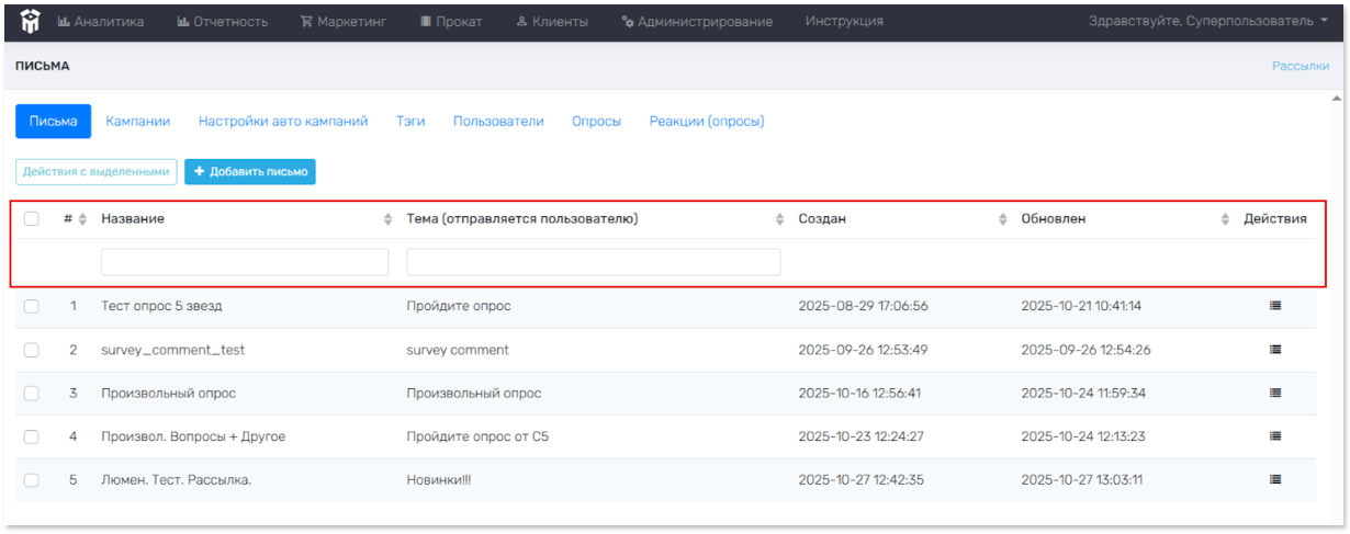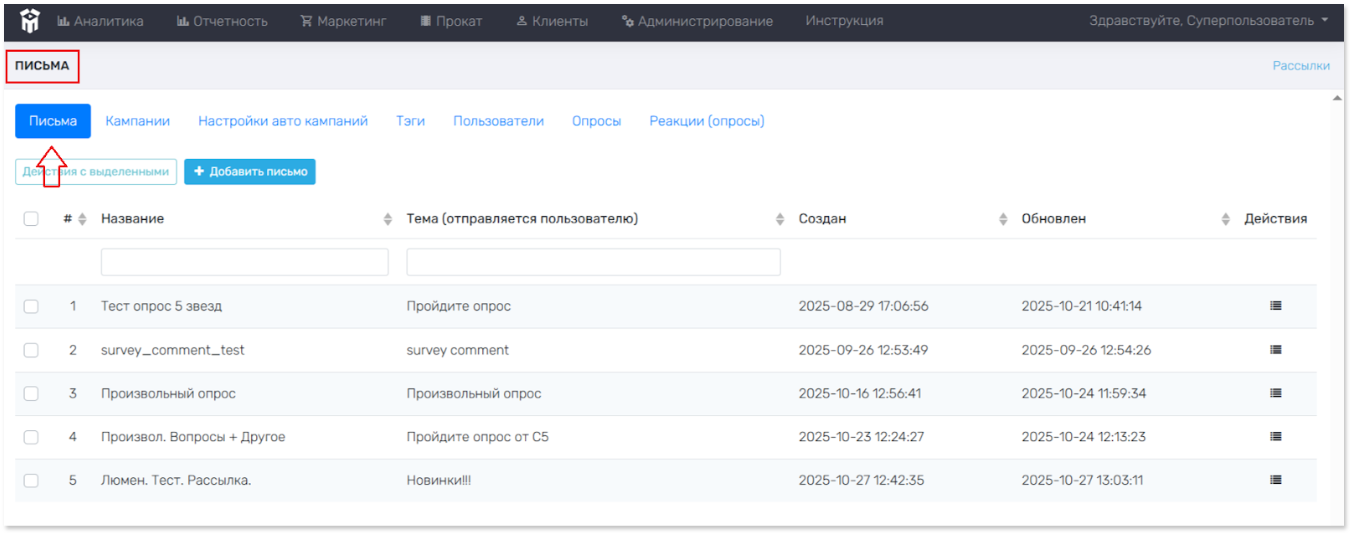 Для изменения созданных писем необходимо использовать основное меню раздела (выделено в красную рамку на рисунке ниже).