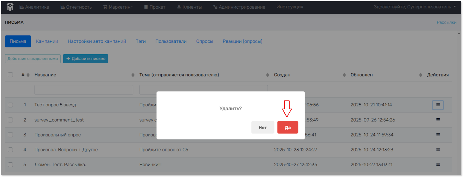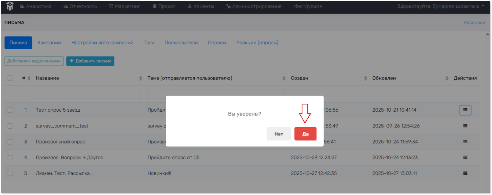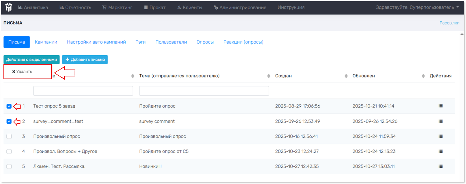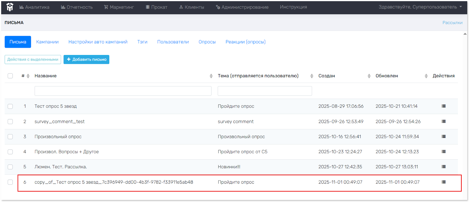 Для изменения созданных писем необходимо использовать основное меню раздела (выделено в красную рамку на рисунке ниже).