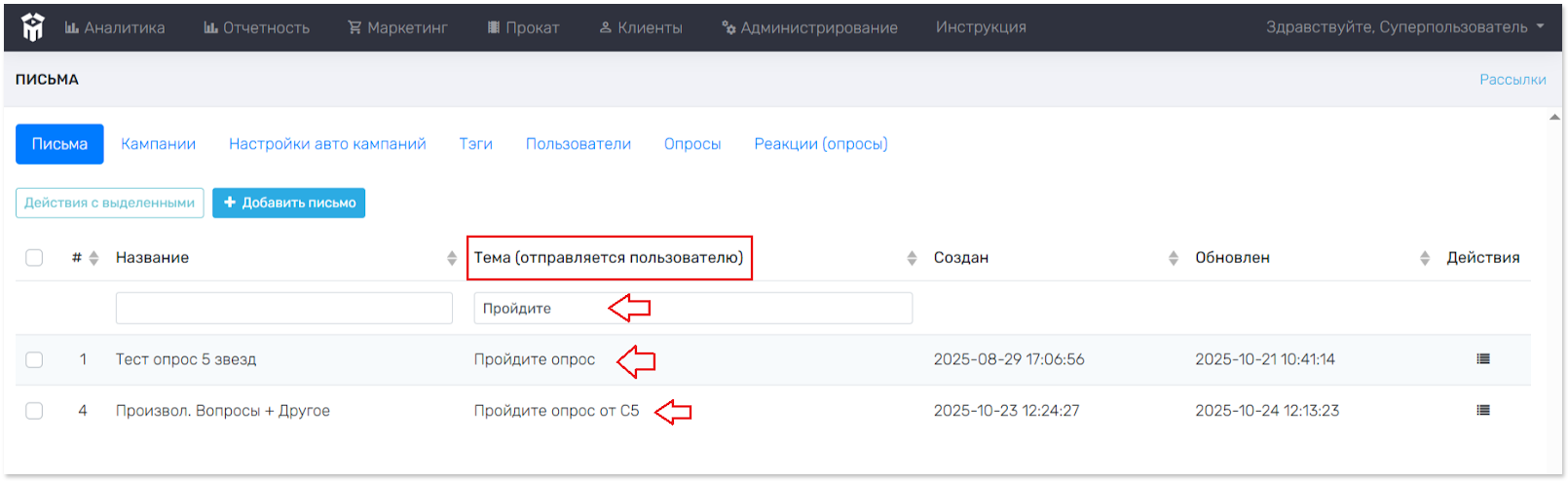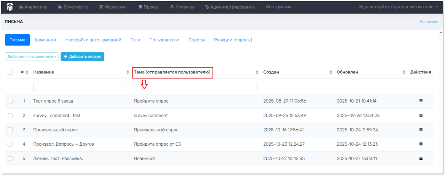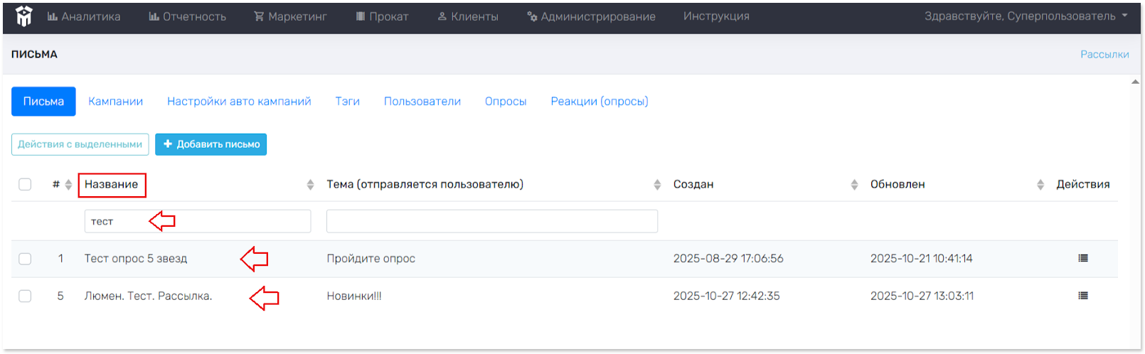 - Название – указано название письма. В случае, если требуется найти/сортировать письма по названию, необходимо нажать левой кнопкой мыши на пустую строчку (расположена под «Названием») и ввести название письма. После этого раздел Письма автоматически обновится. Для удаления названия письма, необходимо нажать на в строчке для ввода текста;