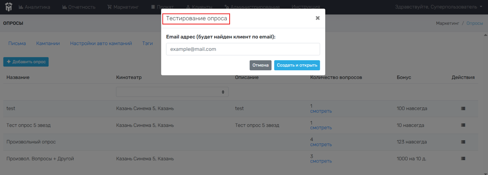 Далее откроется меню, в котором необходимо указать Email адрес для отправки опроса, затем нажать на значок «Создать и открыть».