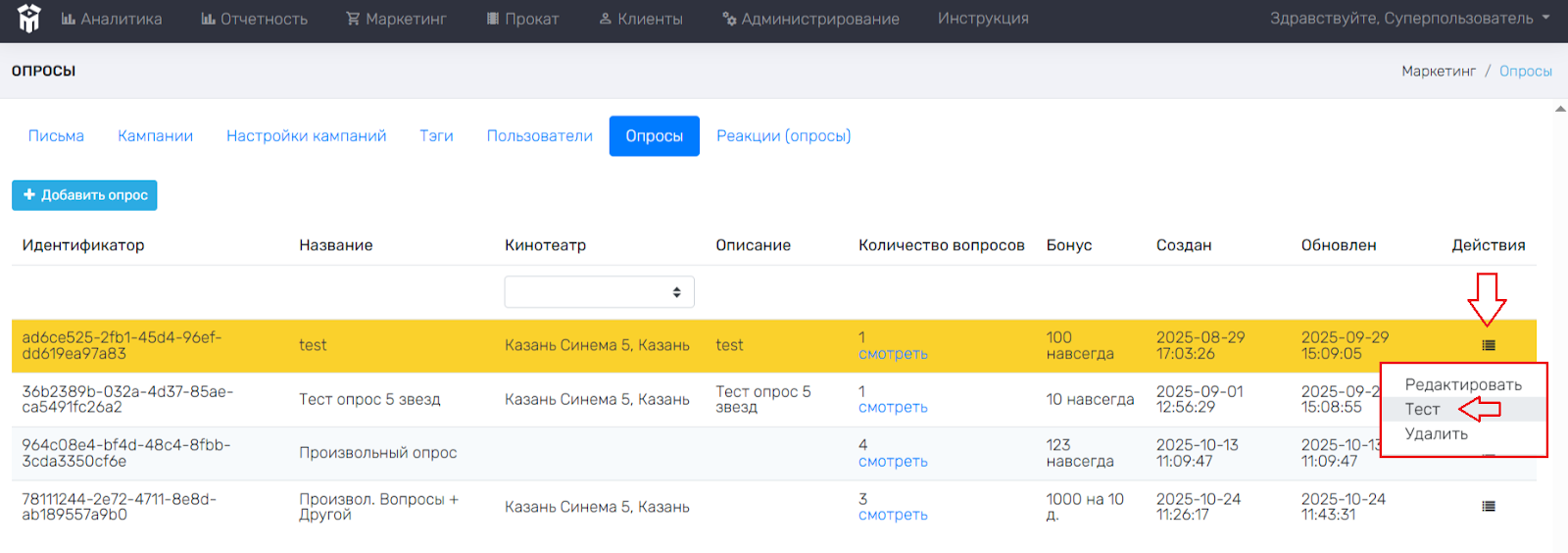 Перед запуском опроса необходимо Протестировать опрос. Для этого необходимо перейти в раздел Рассылки и опросы и нажать на значок в строчке с нужным опросом, далее нажать на слово Тест.