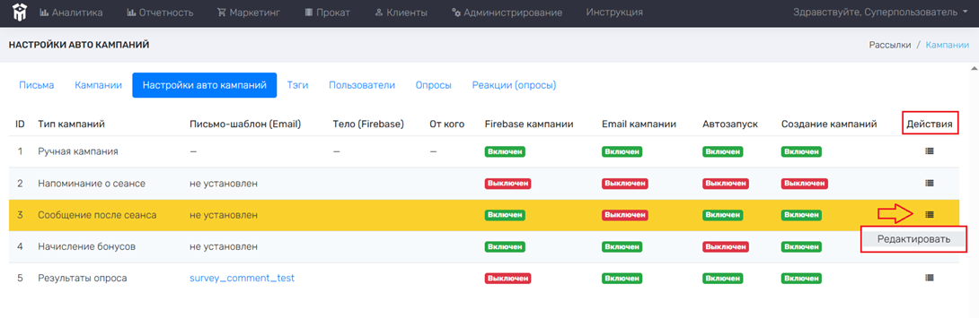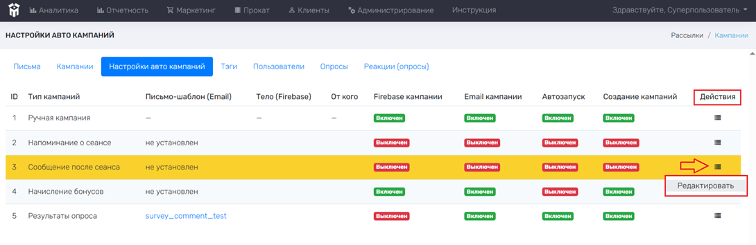 Для запуска опроса Авто кампании, необходимо запустить кампанию во вкладке Настройки авто кампаний. Для этого необходимо нажать на значок в строчке с нужной кампанией, далее нажать на Редактировать.