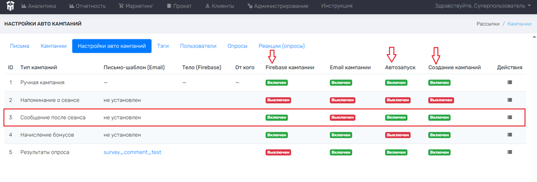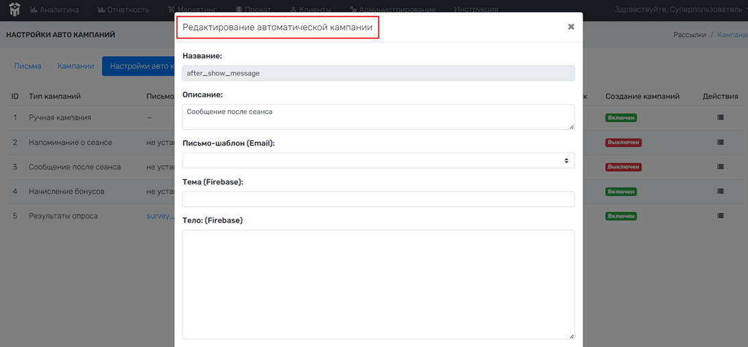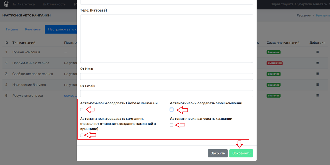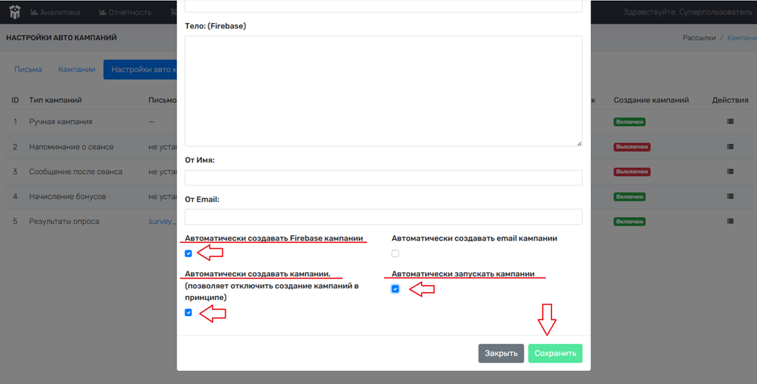 - Автоматически создавать Firebase кампании (если это push-уведомления)
