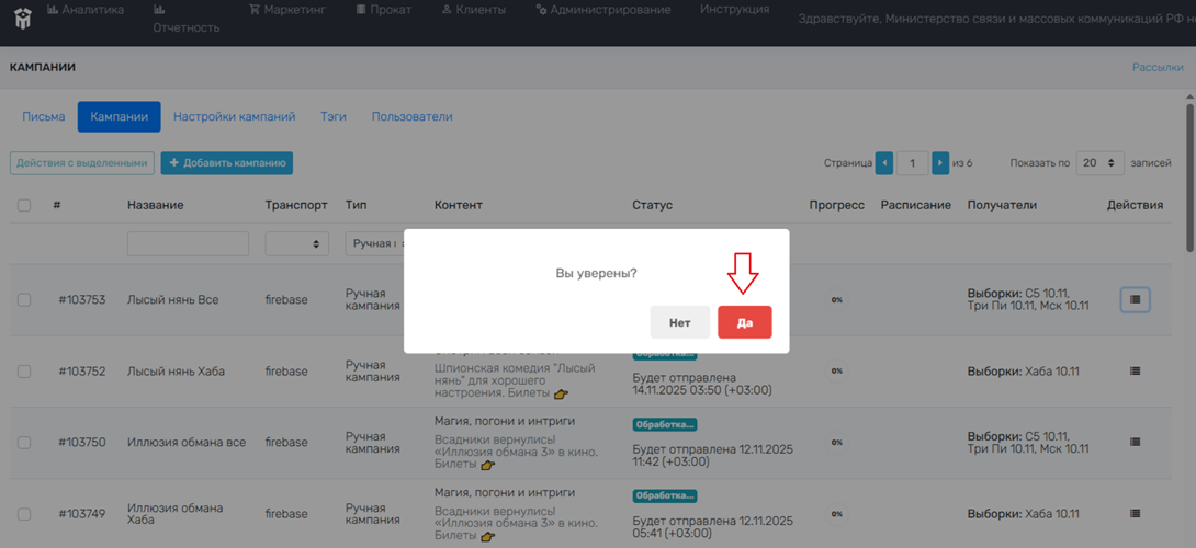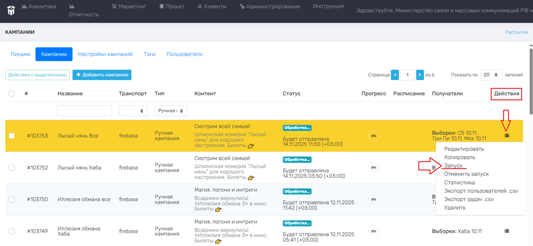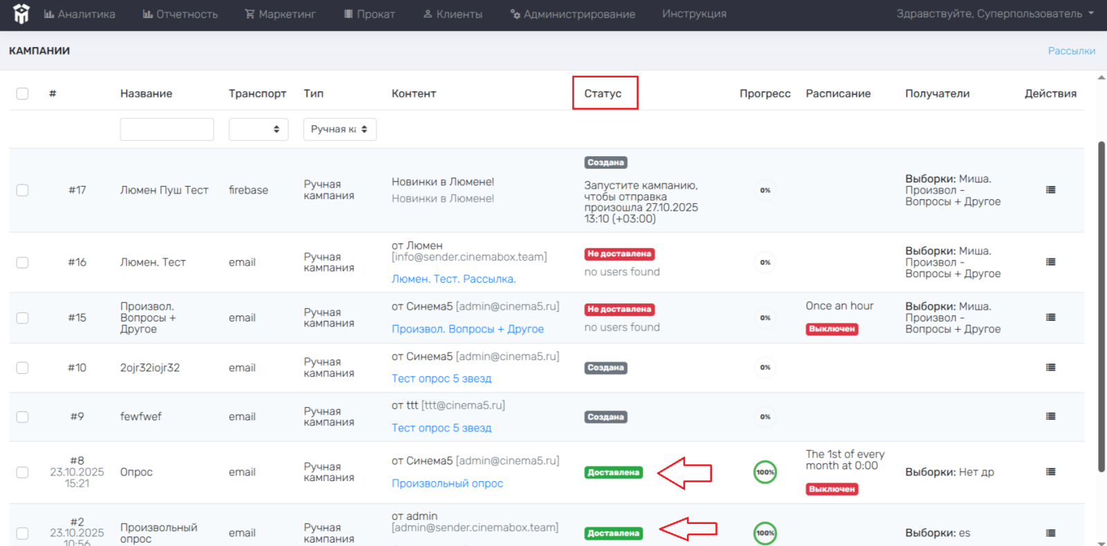 После запуска кампании статус «Создан» автоматически изменится на статус «Доставлен».